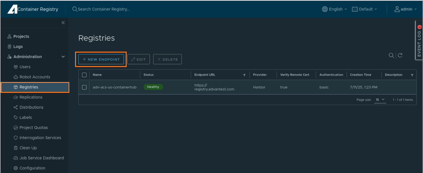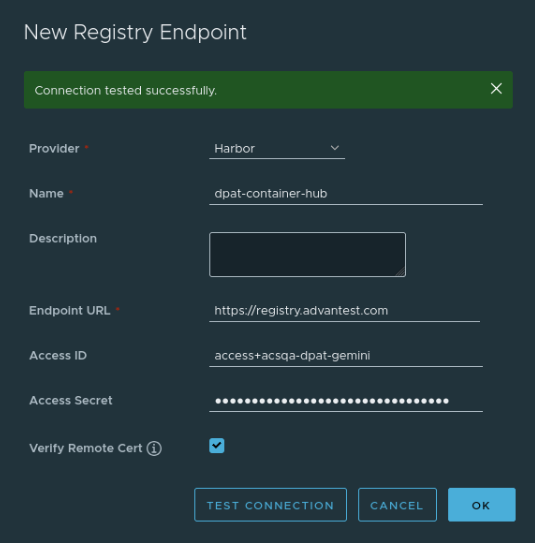Then click “TEST CONNECTION”, after that you will see “Connection Tested successfully” on the top of the dialog, click “OK” to submit the new endpoint to Harbor finally.