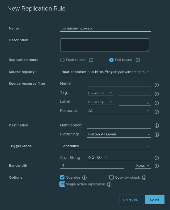 Cron String: input “0 0 */2 * * *” (This means that the replication will be executed every 2 hours automatically)