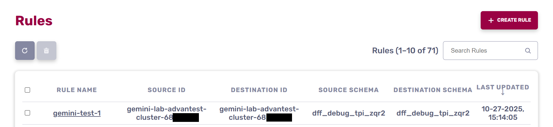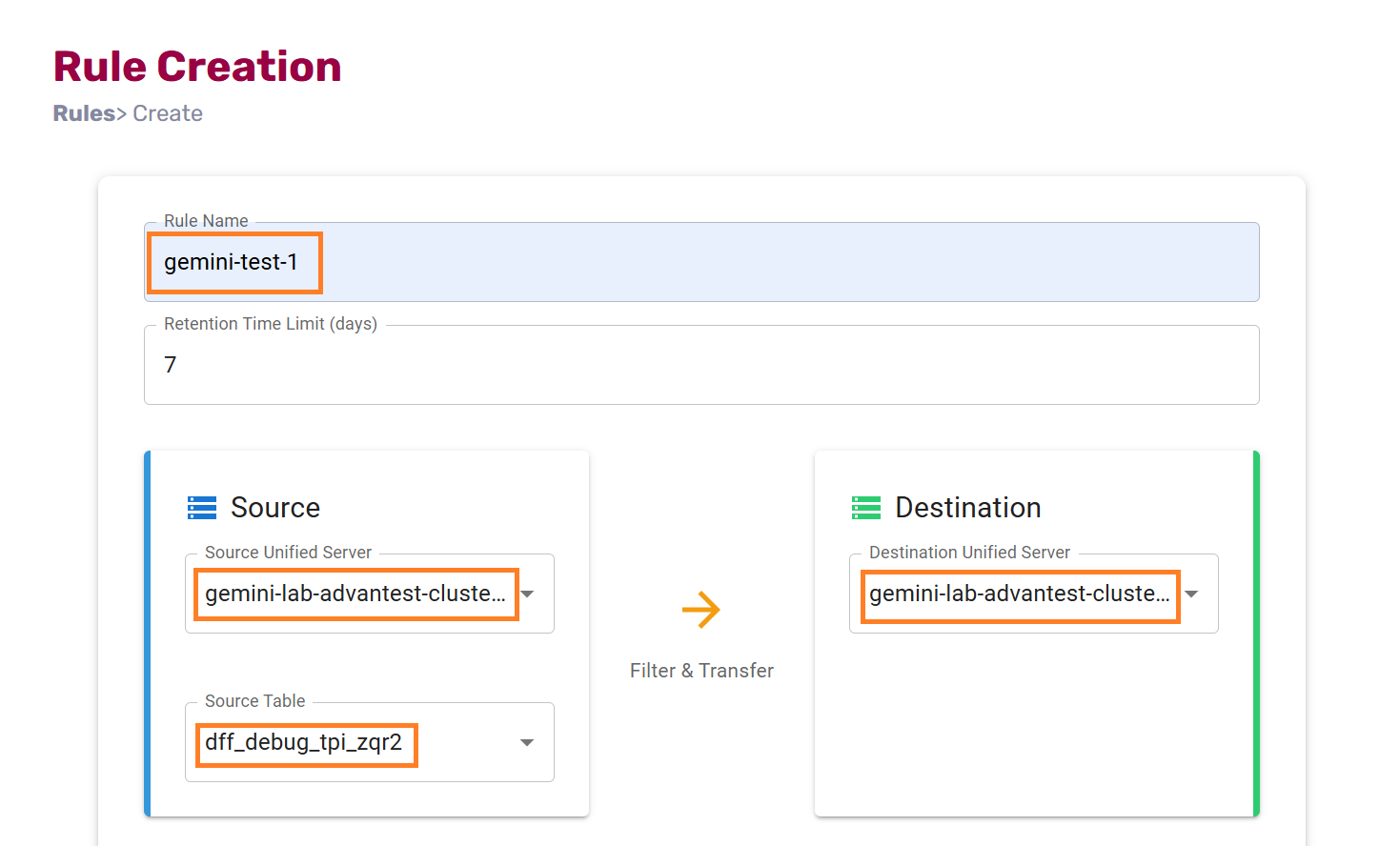 In the “Create Rule” page, enter in rule name, select 1st AUS name in the “Source Unified Server” list, select “dff_debug_tpi_zqr2” source table, select 2nd AUS name in the “Destination Unified Server” list