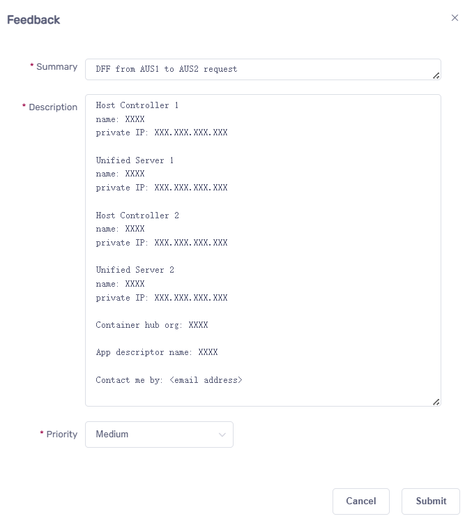 Host Controller 1 name: XXXX private IP: XXX.XXX.XXX.XXX Unified Server 1 name: XXXX private IP: XXX.XXX.XXX.XXX Host Controller 2 name: XXXX private IP: XXX.XXX.XXX.XXX Unified Server 2 name: XXXX private IP: XXX.XXX.XXX.XXX Container hub org: XXXX App descriptor name: XXXX Contact me by: <email address>