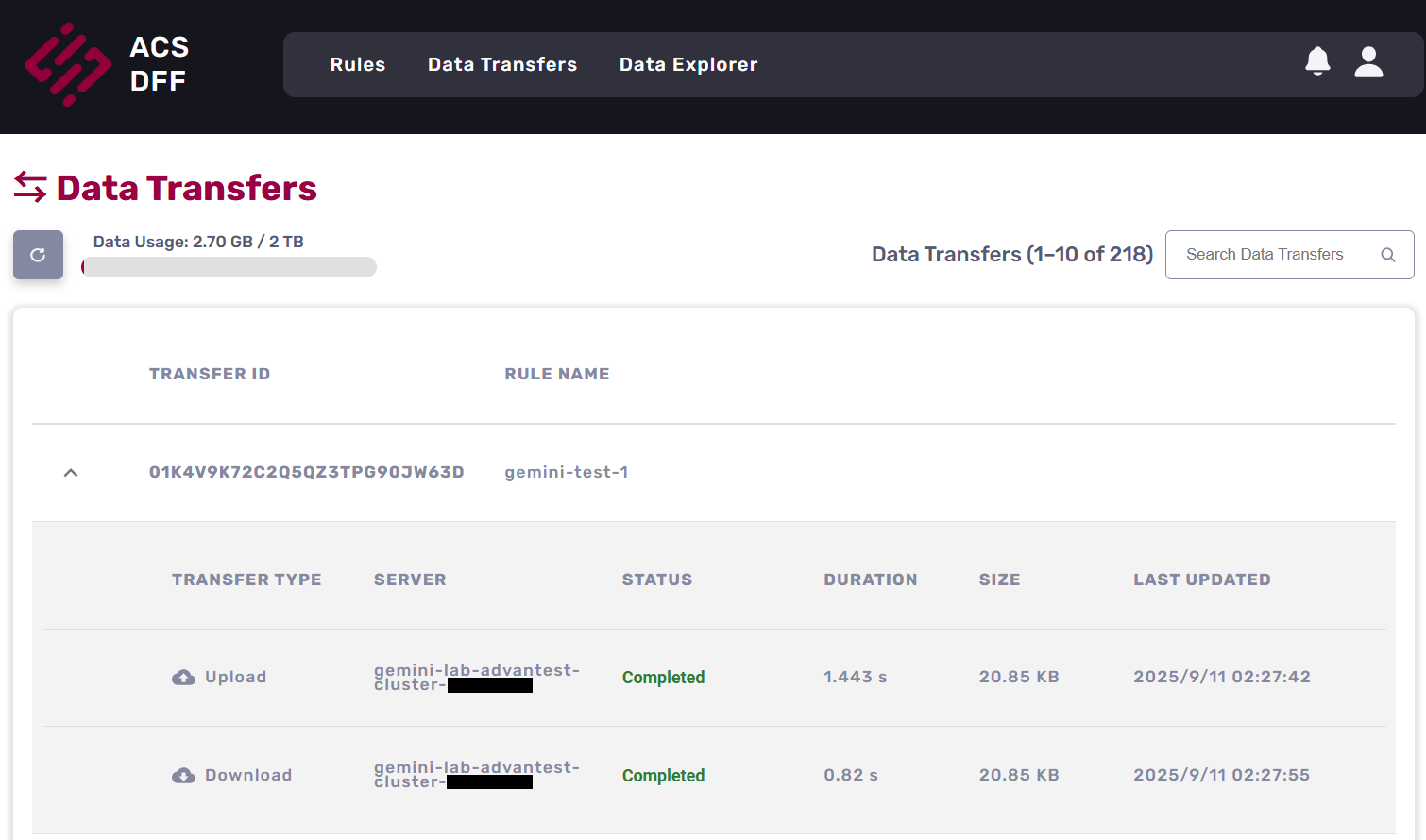 Login to DFF UI website, in the “Data Transfers” page, you can confirm the test data is transfered to 2nd AUS