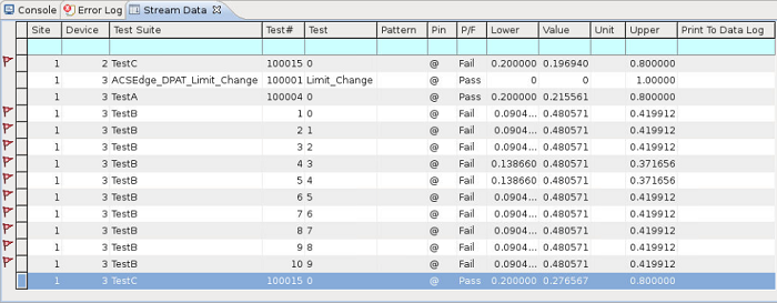 To observe the limit changes, open the Result Perspective in SmarTest7. In the Stream Data tab, filter the Test Suite to show only TestB: