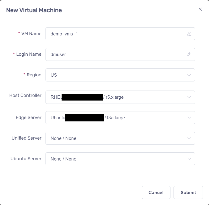 In the popped up dialog, enter “VM Name” and “Login Name”, select “Host Controller” and “Edge Server”, then click the “SUBMIT” button.