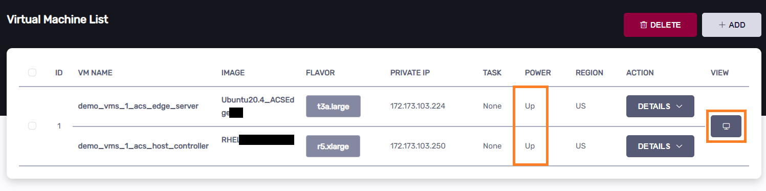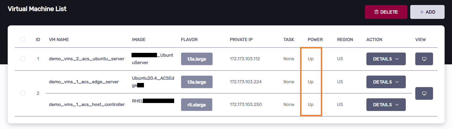 Wait about 5 minutes for the VMs to be created. The new VMs will appear in the virtual machine list with their status as “UP”.