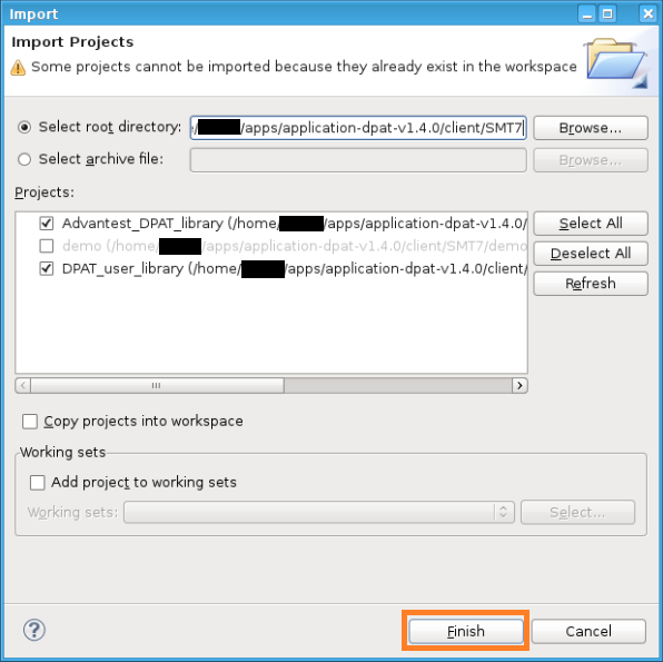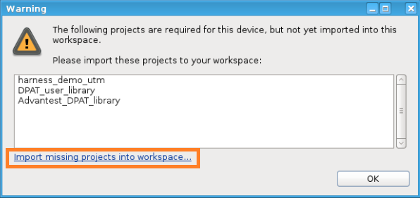 In the popped up warning dialog, click “Import missing projects into workspace…”