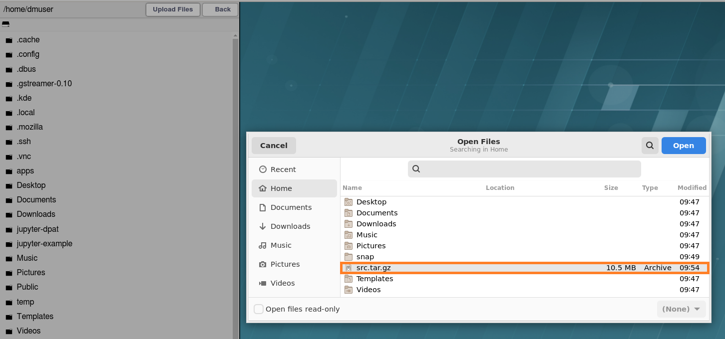 Select the file “src.tar.gz” in the dialog then click the “Open” button